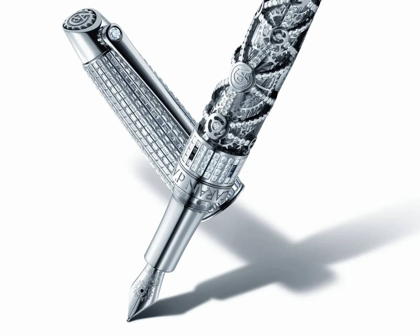 Three kinds of diamond cuts embellish this million-dollar fountain pen: Sensible, Emerald, and Baguette-cut. The barrel’s intricate, gear-like design makes the pen look as if it has the heart of a watch. This Swiss-made pen writes with an 18kt gold nib.