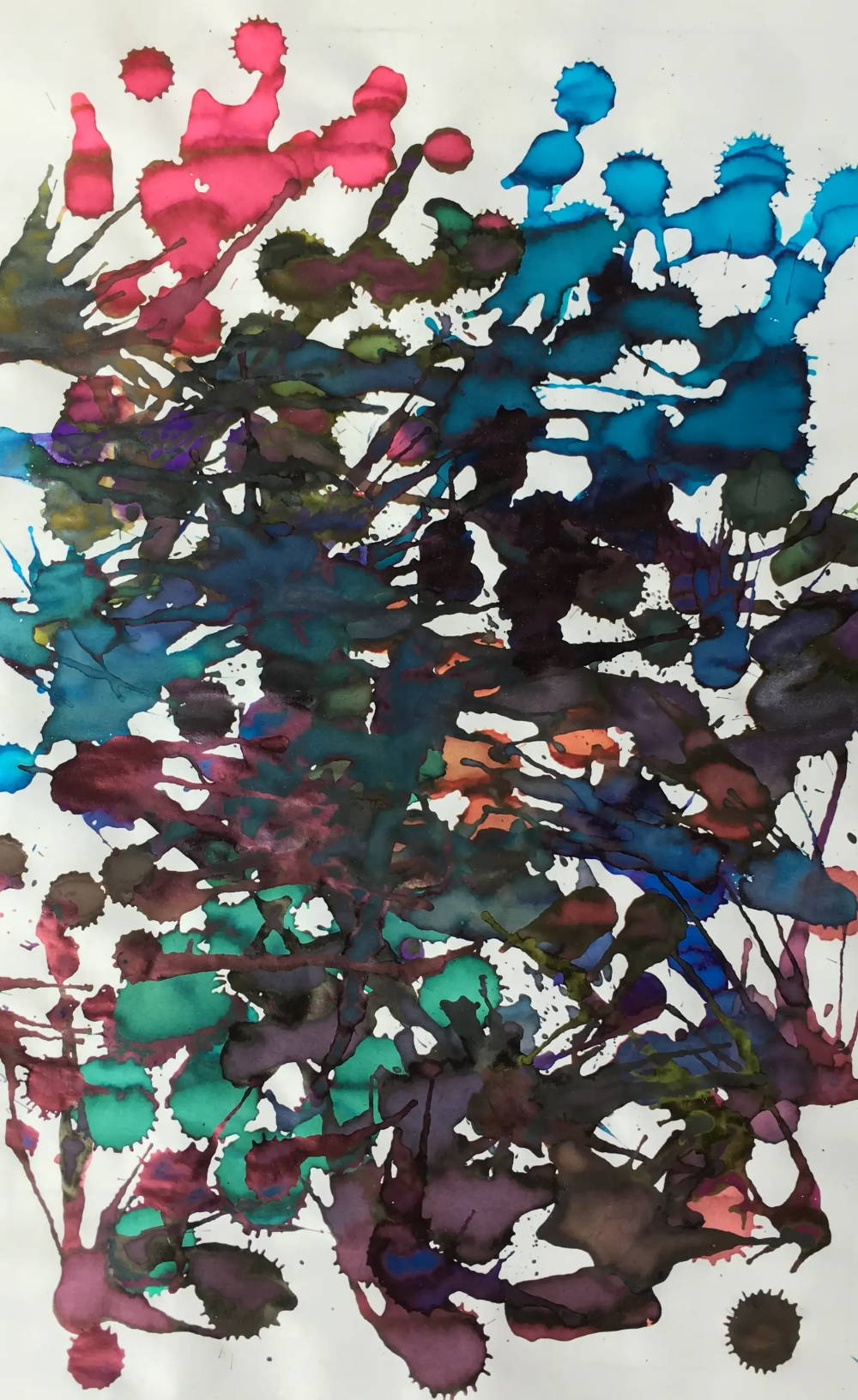 This ink illustrates the insanity of King Lear (William Shakespeare) displaying tragical pink glitter on a greenish-gray base ink. Because the ink dries, pink glitter reasonably seems.